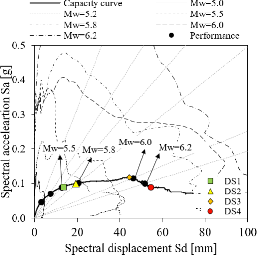 Earthquakes are the major causes of damage and loss to the built environment, including cultural heritages, monumental buildings, and historical centres. Many regions with predominant active tectonic plates and high seismicity lack recorded ground motion datasets regarding large-magnitude events or near-field records. Among them, the Azores islands in Portugal are the regions with high seismicity. The traditional buildings from the Azores are mainly constituted of rubble stone masonry, which represents one of the weakest materials once subjected to seismic loads. The seismic performance of buildings has recently increased, given the public awareness related to damage prediction and risk mitigation during earthquakes. This study uses the stochastic finite-fault ground motion simulation approach to simulate region-specific scenario earthquakes in the Azores Plateau at bedrock. Simulations are accomplished by considering the stochastic behaviour of input-model parameters in terms of source and path attenuation effects. As a result, the dataset includes a wide range of moment magnitude and source-to-site distance due to the rupture of active faults in the Azores Plateau. Structural models are simulated using an equivalent frame model. Subsequently, analytical fragility curves are derived for these structures using the generated ground motion datasets. Results reveal that the studied structures are vulnerable to seismic actions.